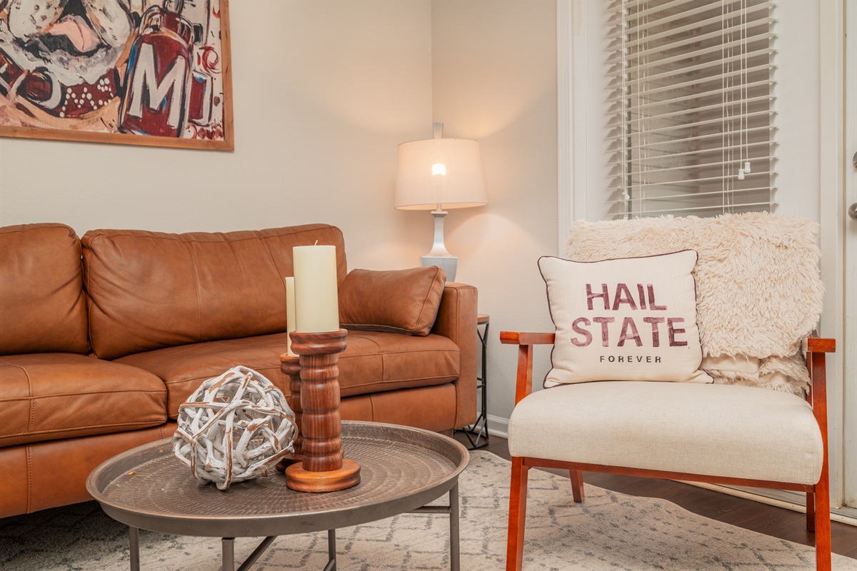Kick back in this cozy, light-filled living room with Bulldog spirit — the perfect place to gather, relax, and get game-day ready.