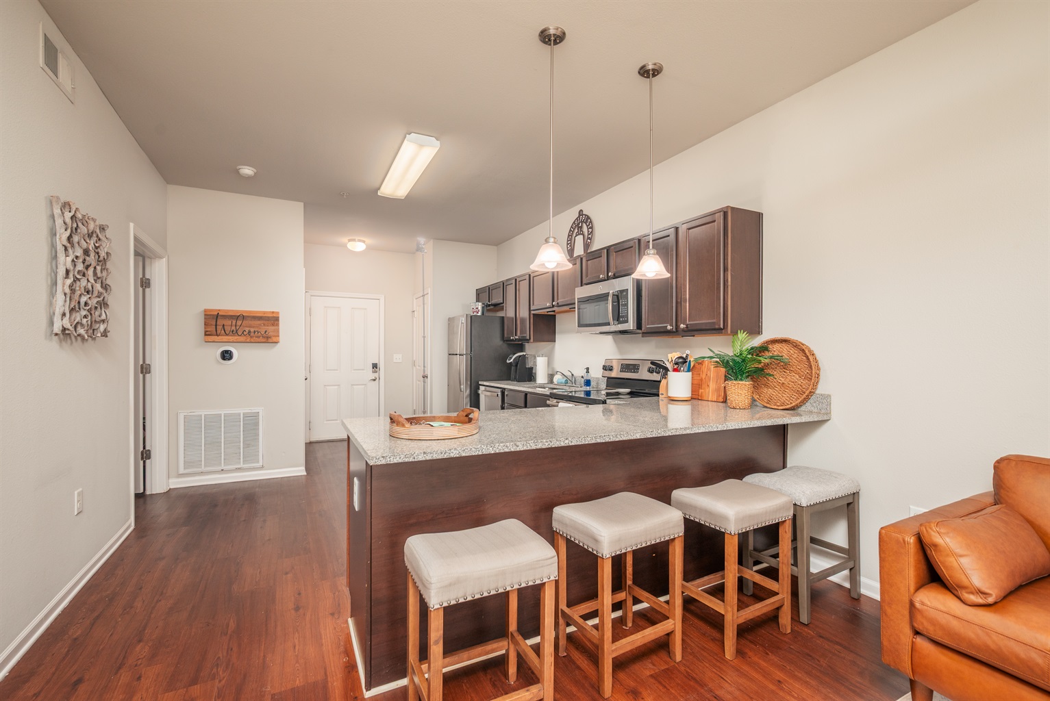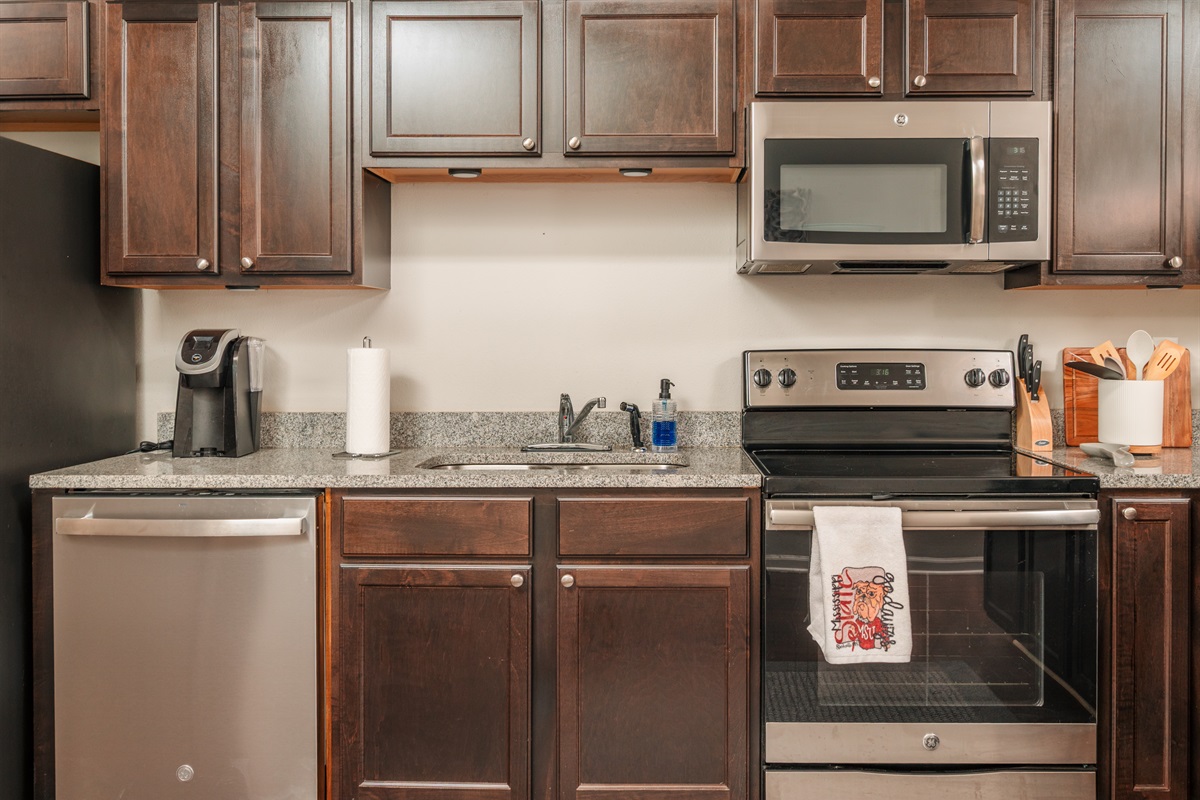 Whip up breakfast before the game or enjoy late-night snacks in the fully stocked kitchen with stainless appliances and an open layout made for hanging out.”