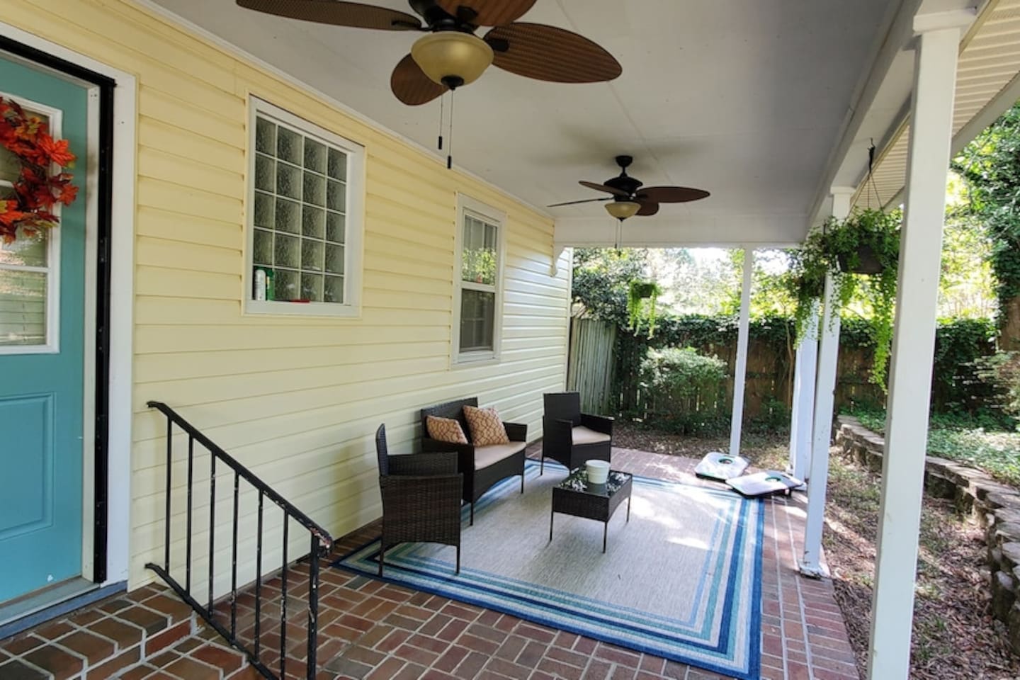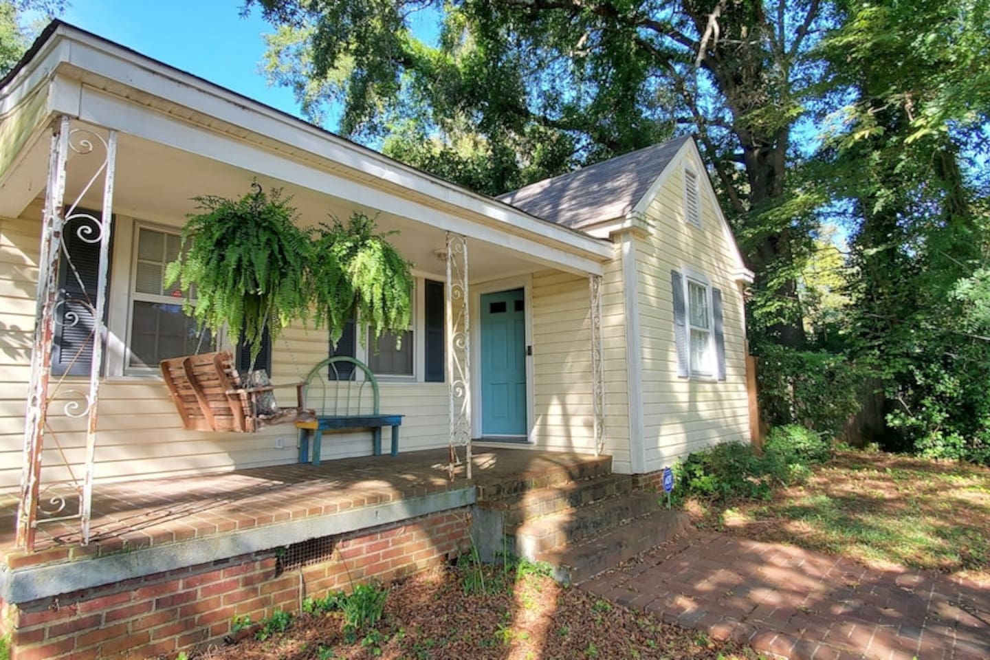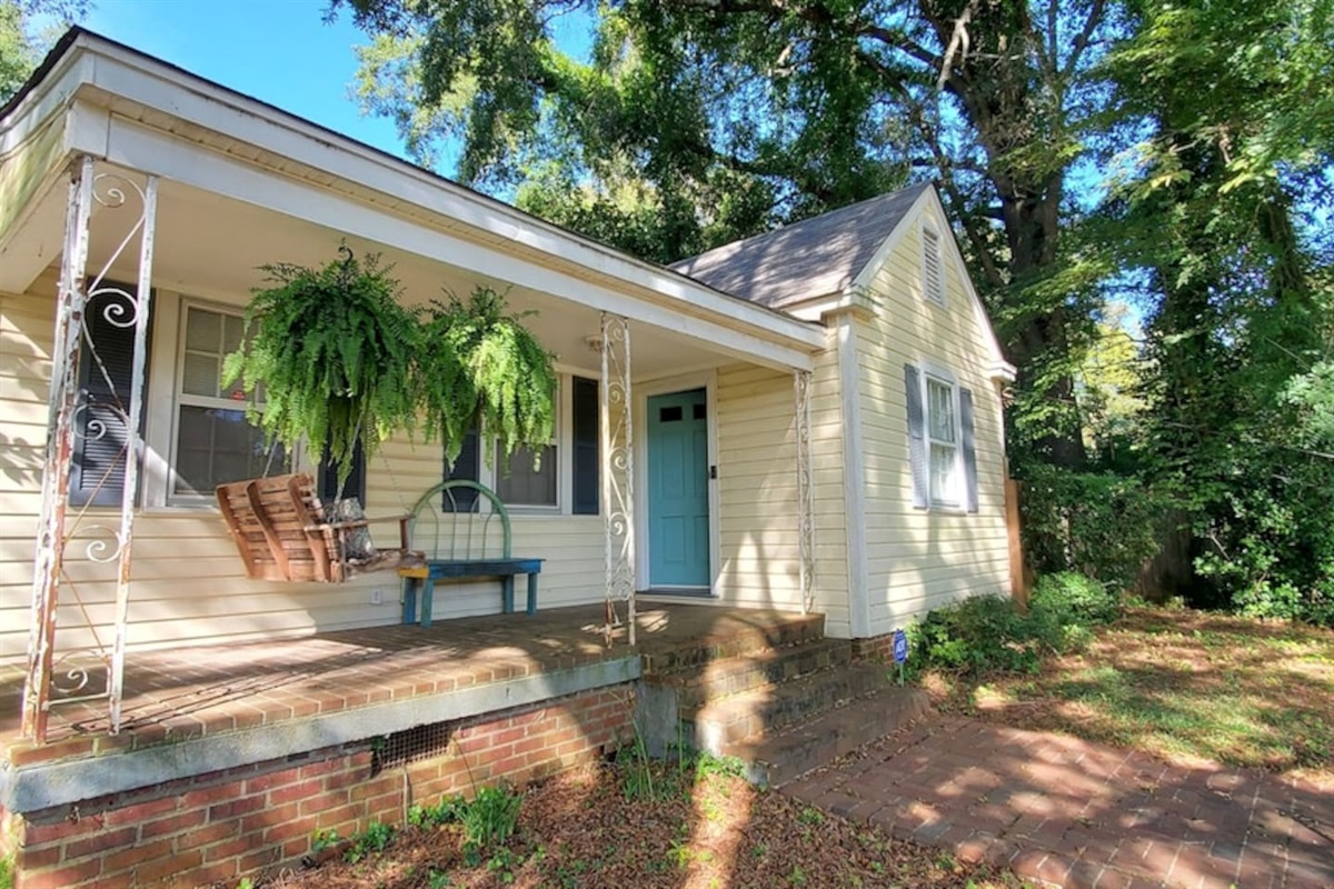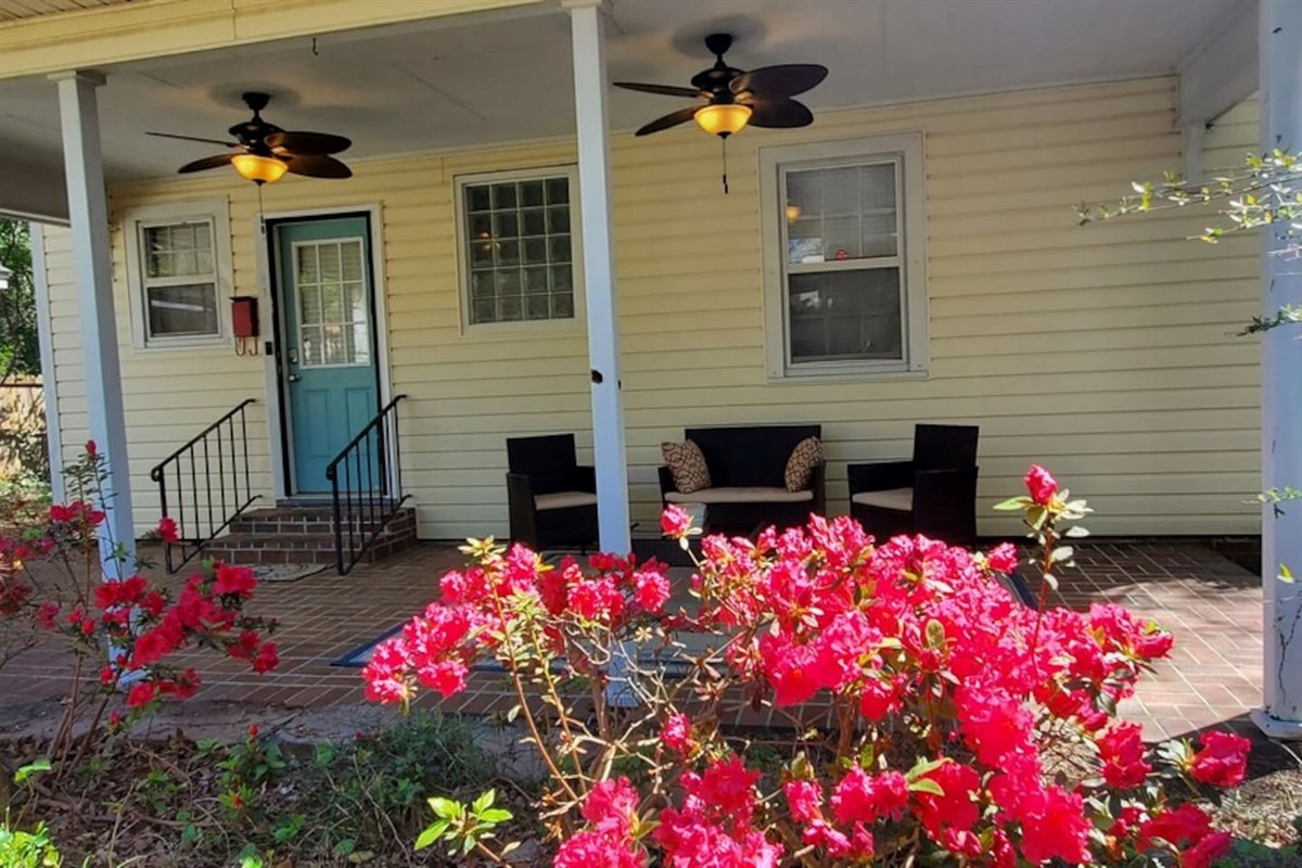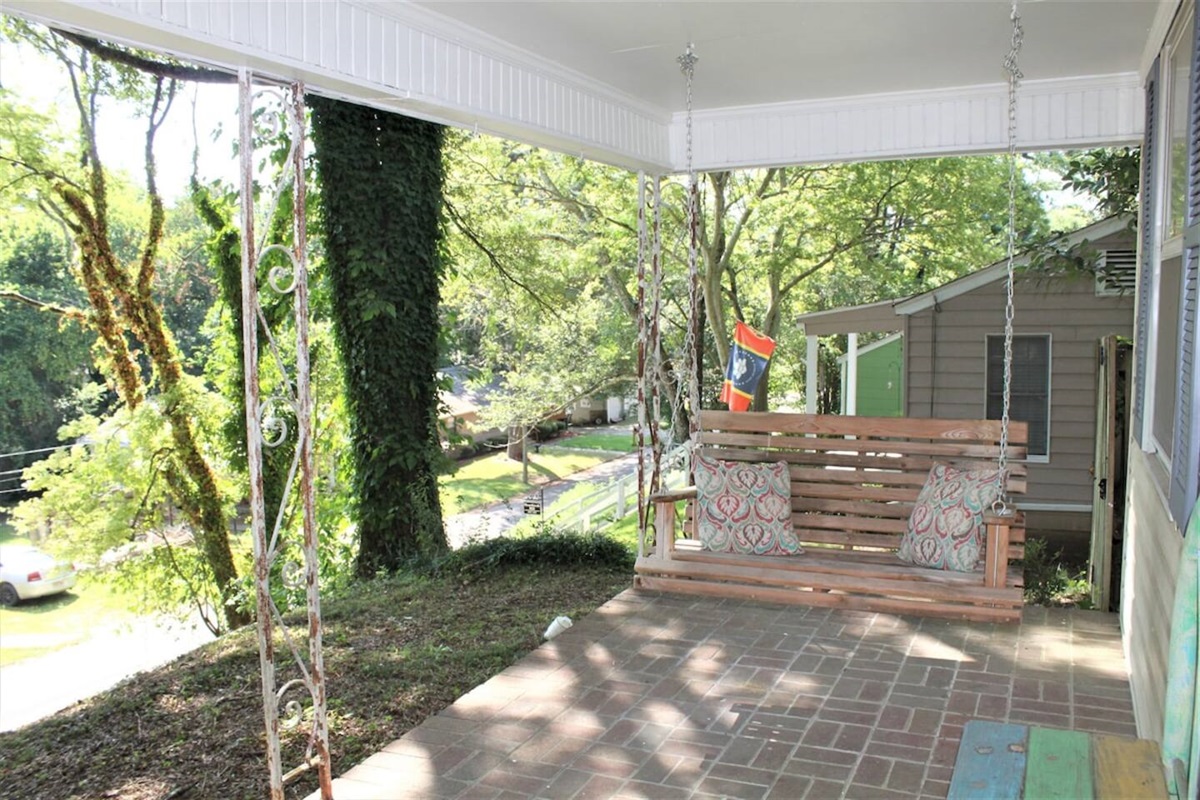 You'll love the large private back porch. It's great for relaxing, hanging out and watching the sun set. The front porch offers a swing and has over 30 steps leading down to road. It really is on a hill! Don't worry though, you won't have to climb those steps unless you really want to! Access to the house only requires a few steps. It's also a great neighborhood to walk and see historic homes nearby.