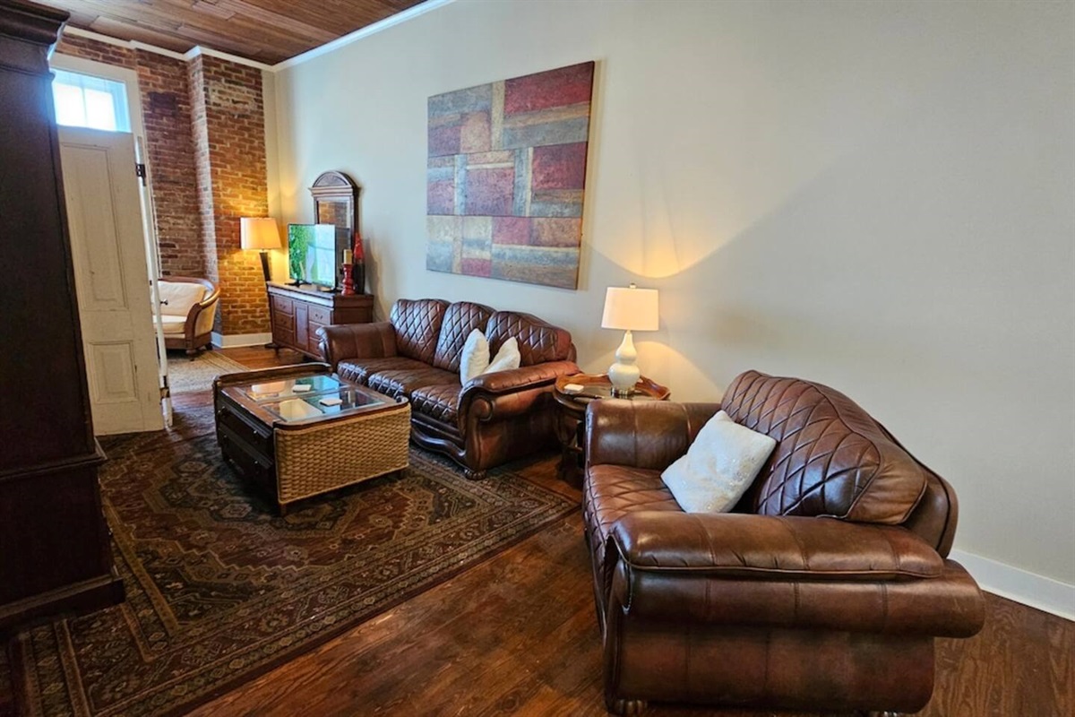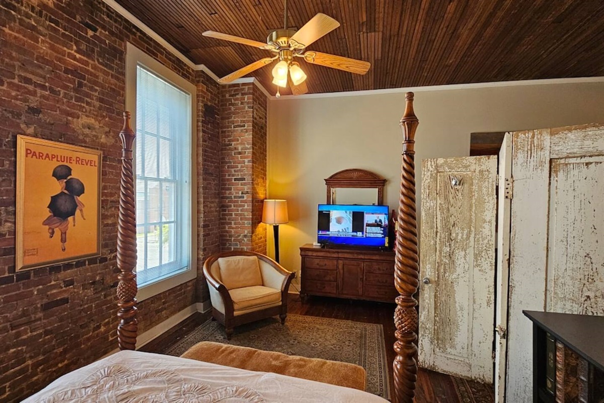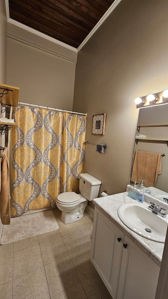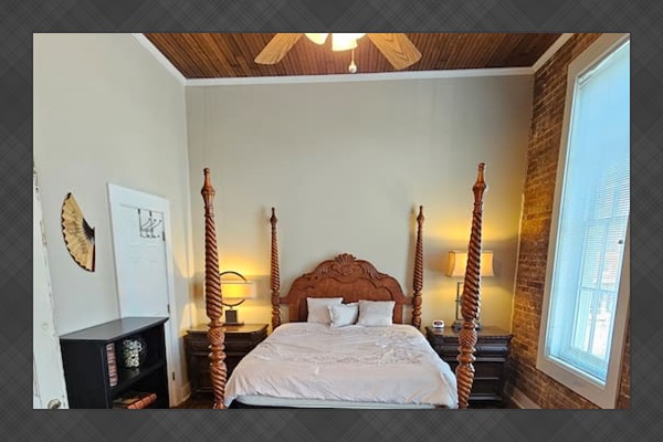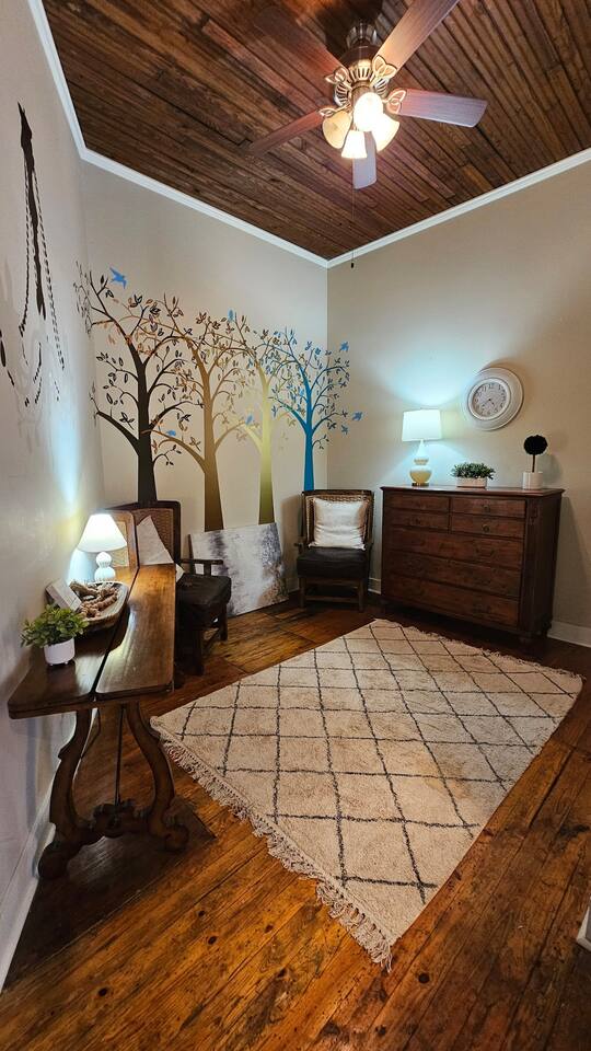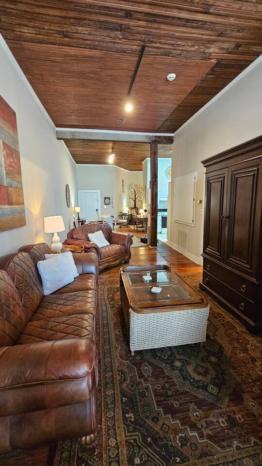With 12-foot ceilings, original 100-year-old hardwood floors (with a few charming squeaks), and an open floor plan, this second-floor loft is full of light, character, and personality. You'll sleep soundly in the plush queen bed and unwind in a spacious living area that’s perfect for lounging after a day of exploring.
