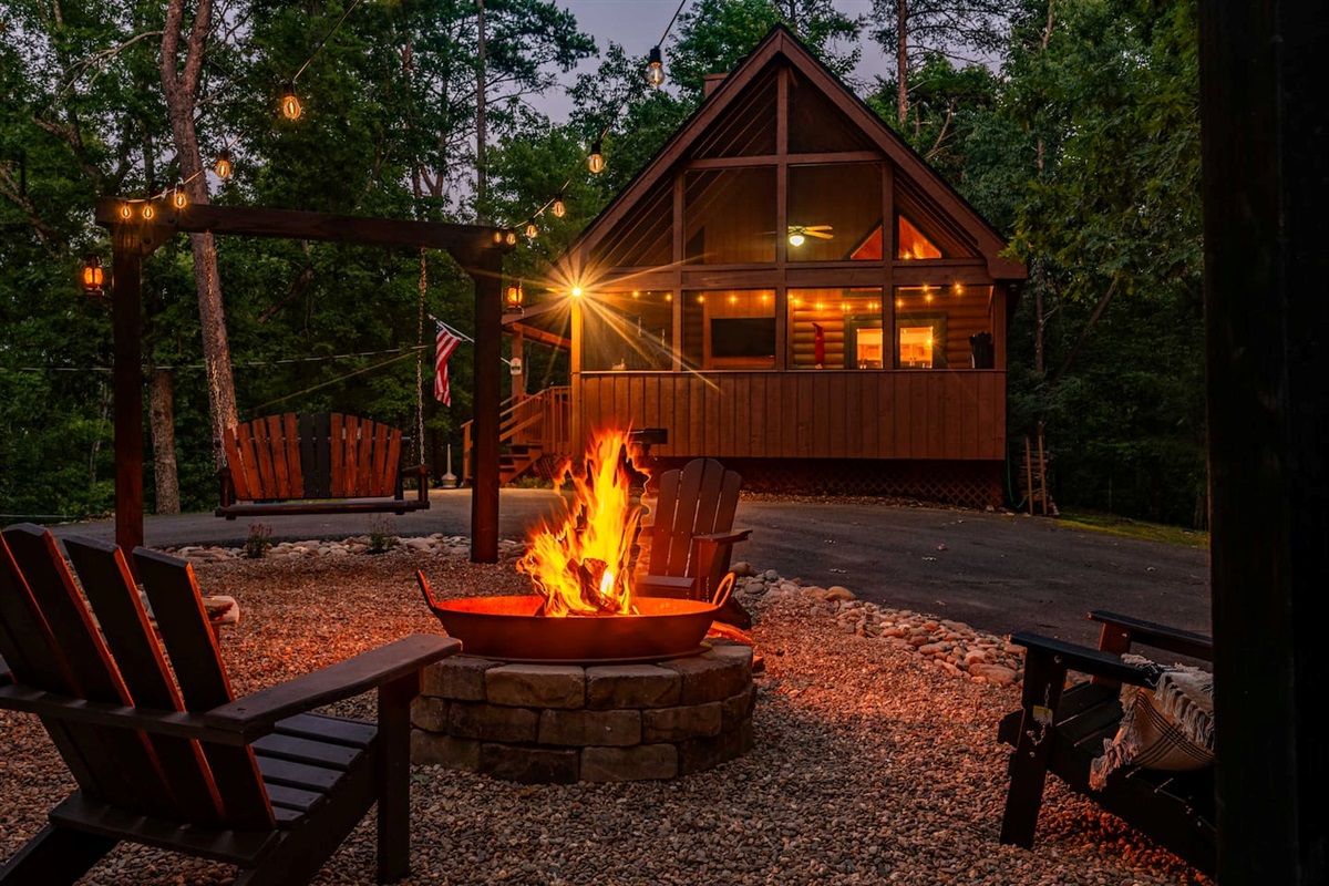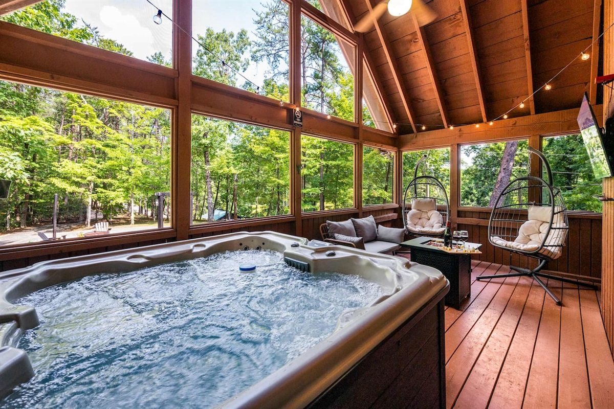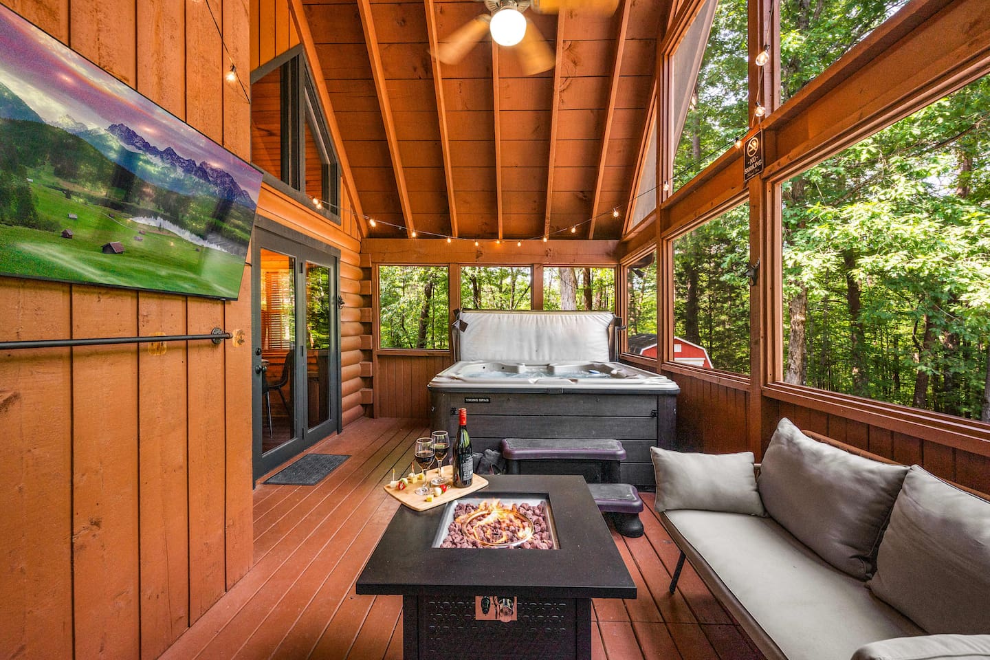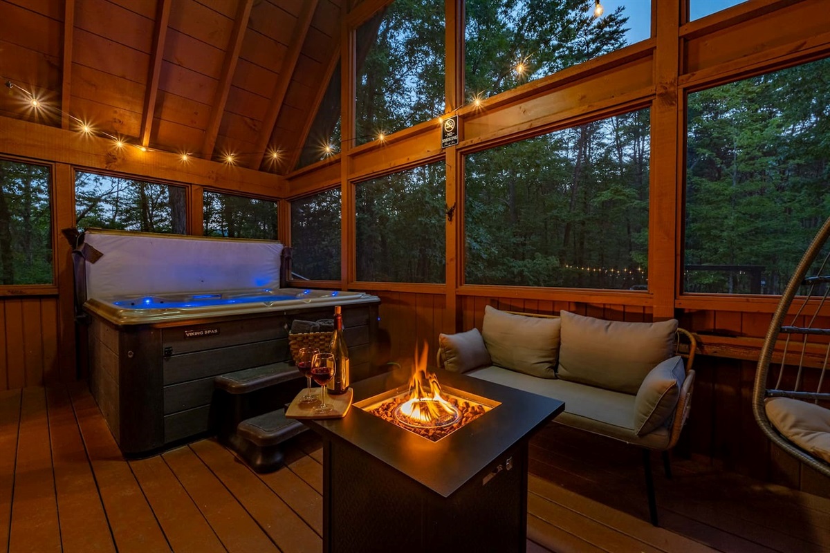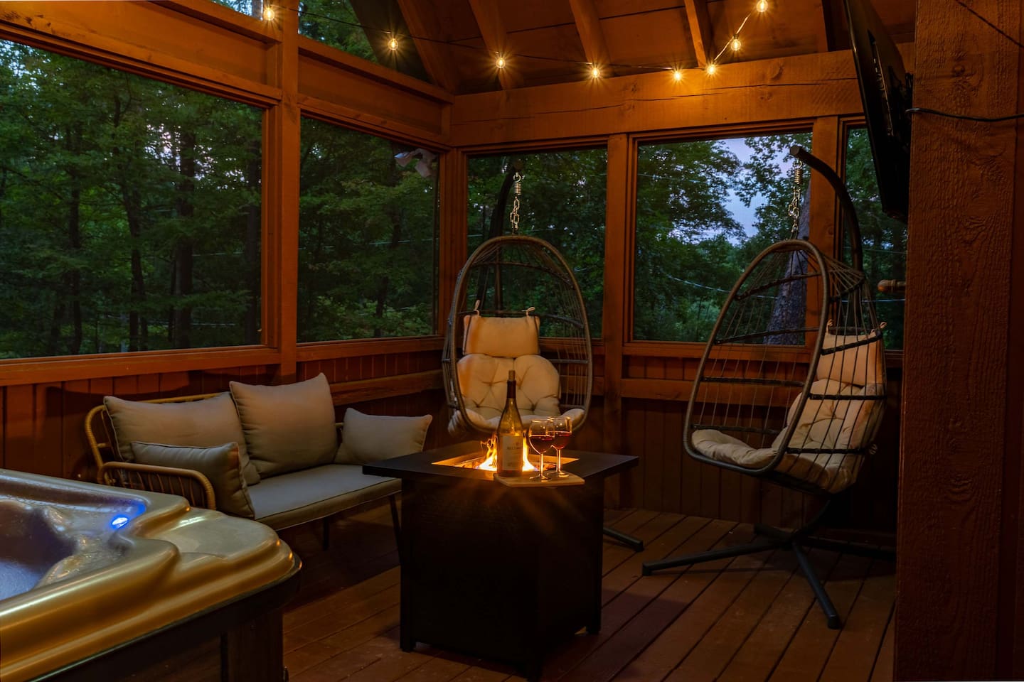 Outdoors? Pure magic. Soak in the hot tub on the screened-in porch, swing beside the fire pit, or snuggle by the indoor gas fireplace. There's even a guitar for you to strum under the stars.