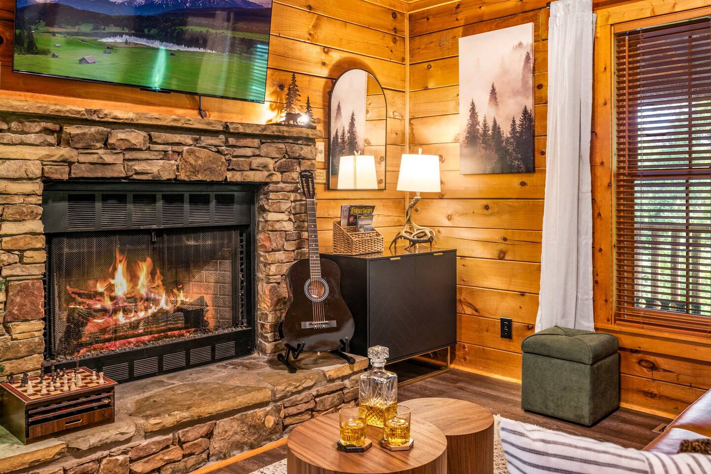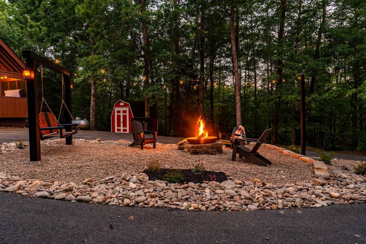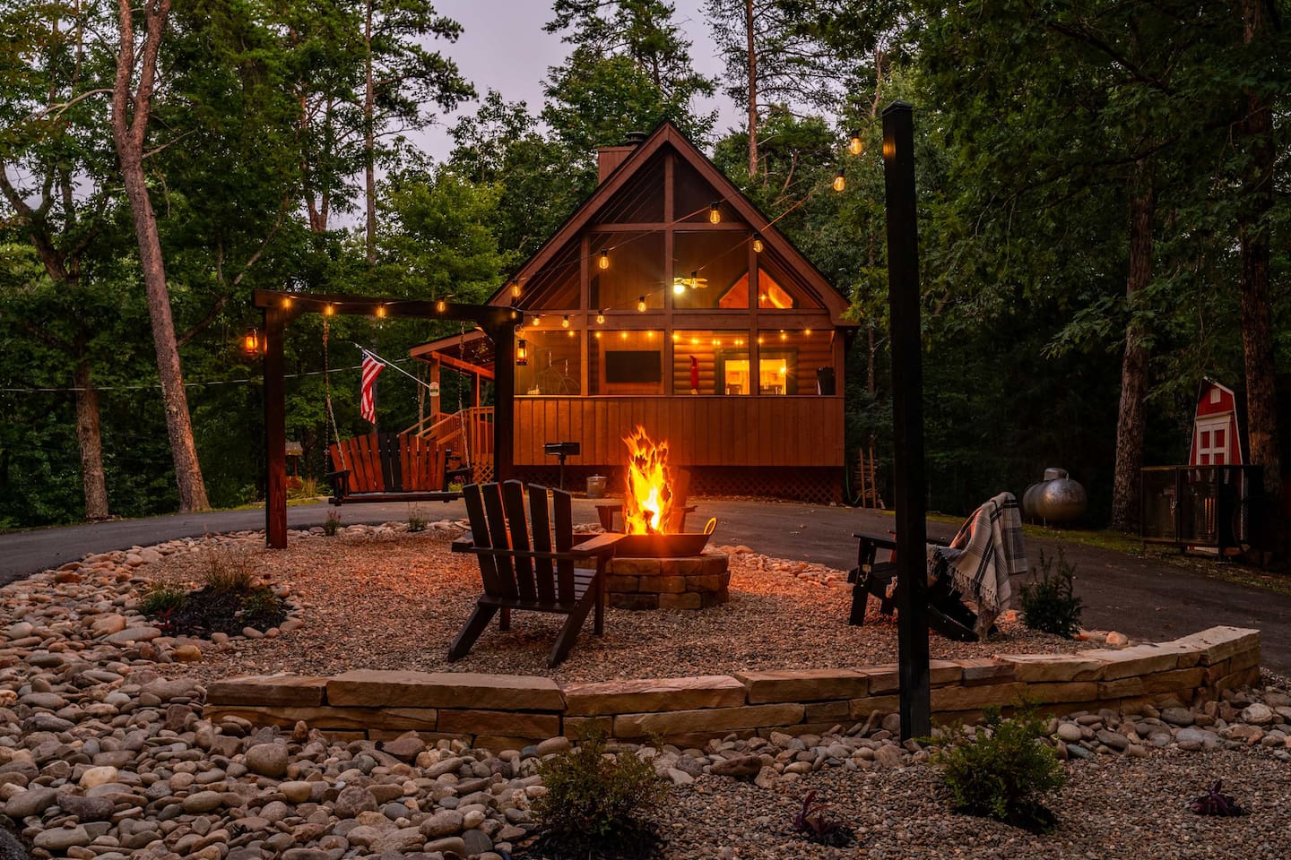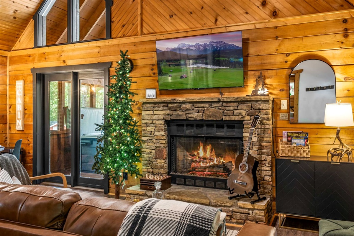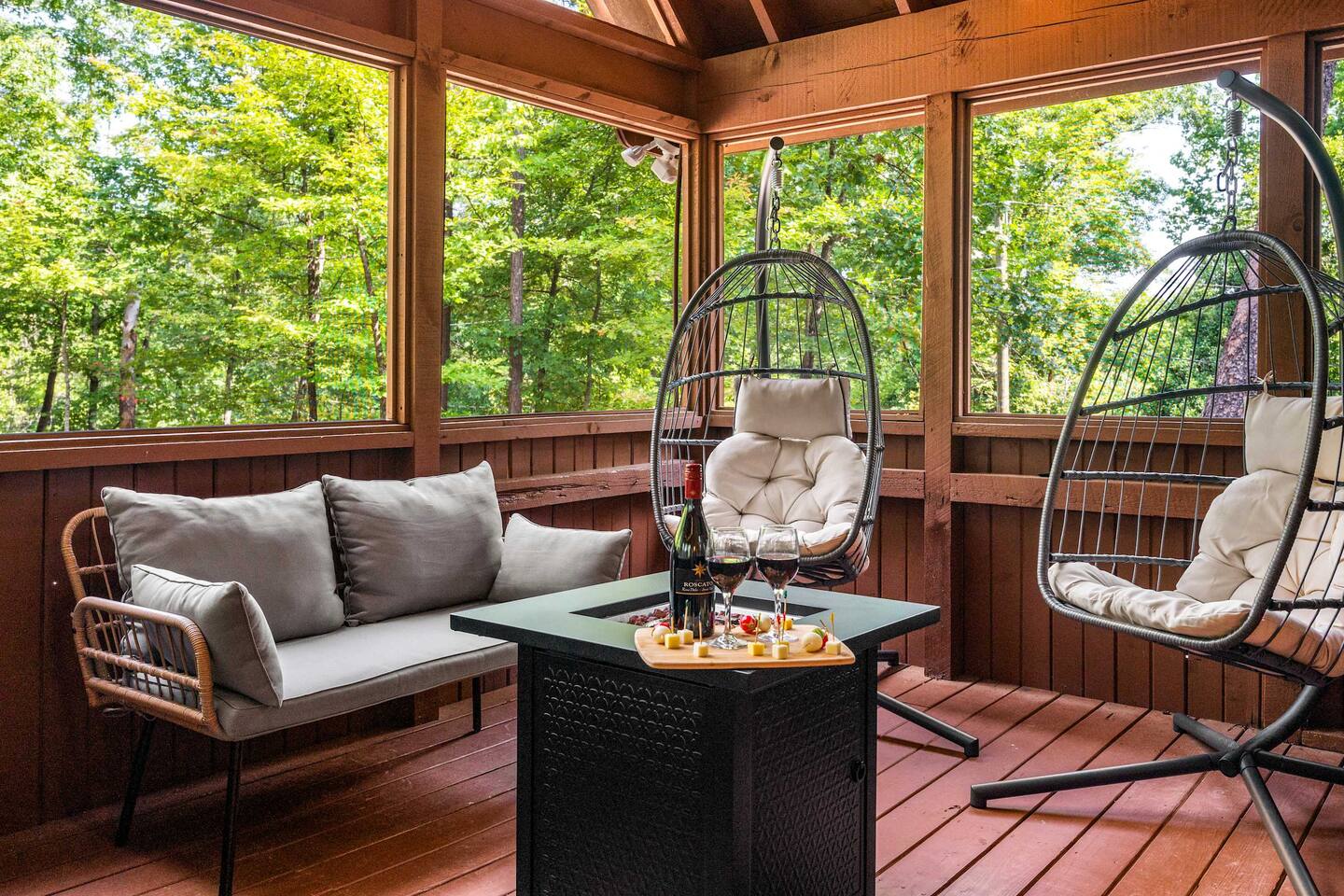 Outdoors? Pure magic. Soak in the hot tub on the screened-in porch, swing beside the fire pit, or snuggle by the indoor gas fireplace. There's even a guitar for you to strum under the stars.