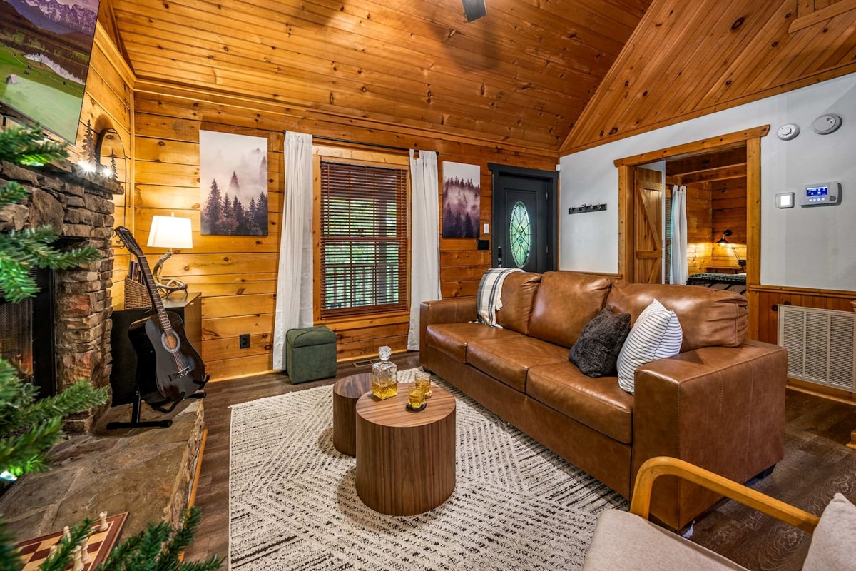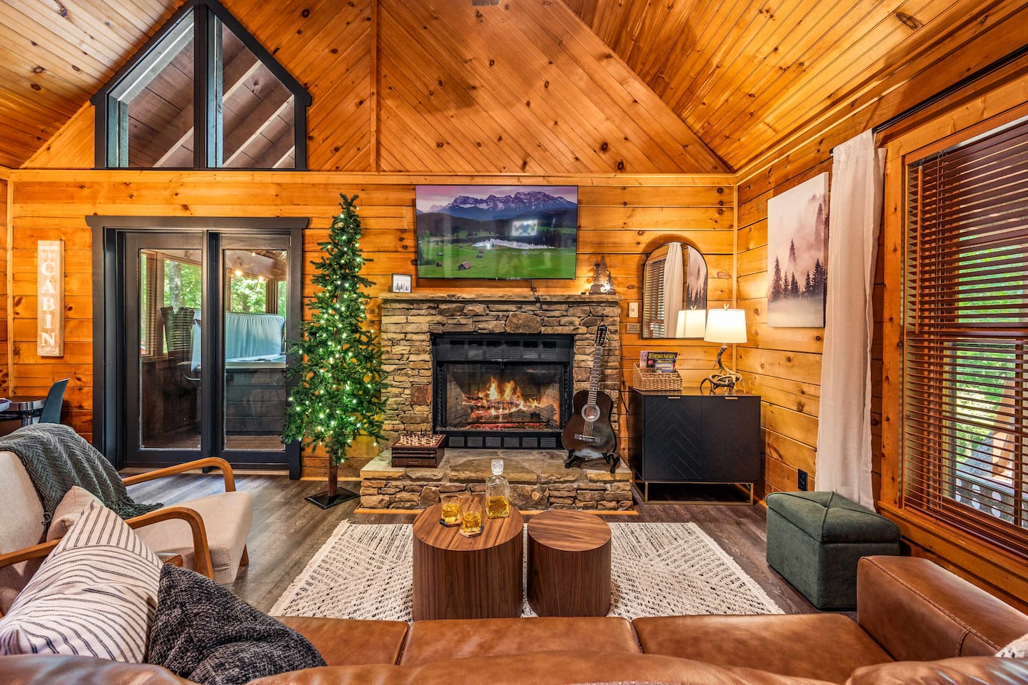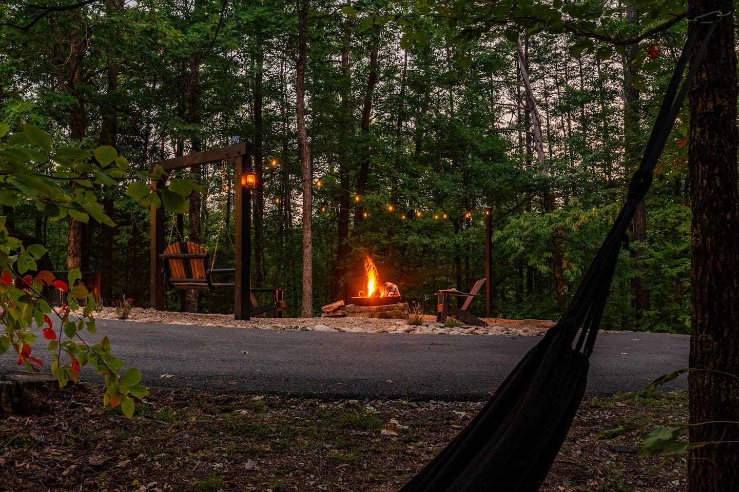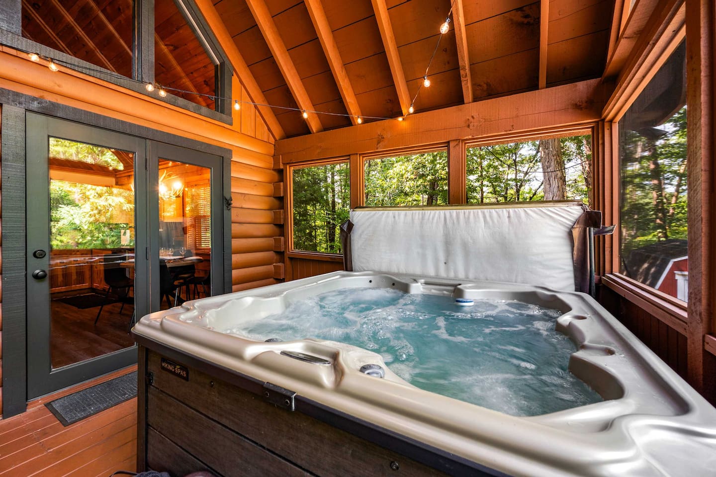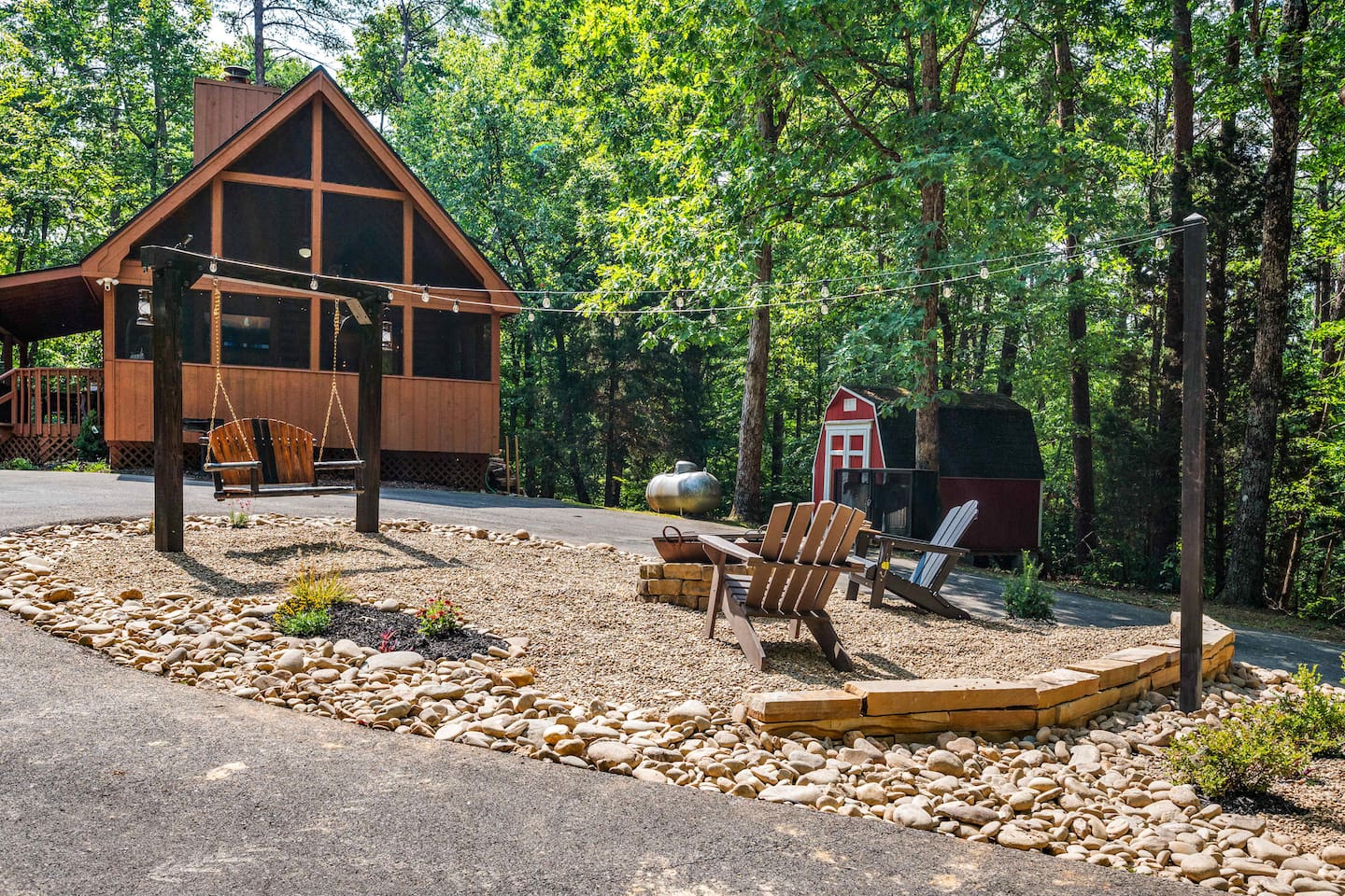 Outdoors? Pure magic. Soak in the hot tub on the screened-in porch, swing beside the fire pit, or snuggle by the indoor gas fireplace. There's even a guitar for you to strum under the stars.