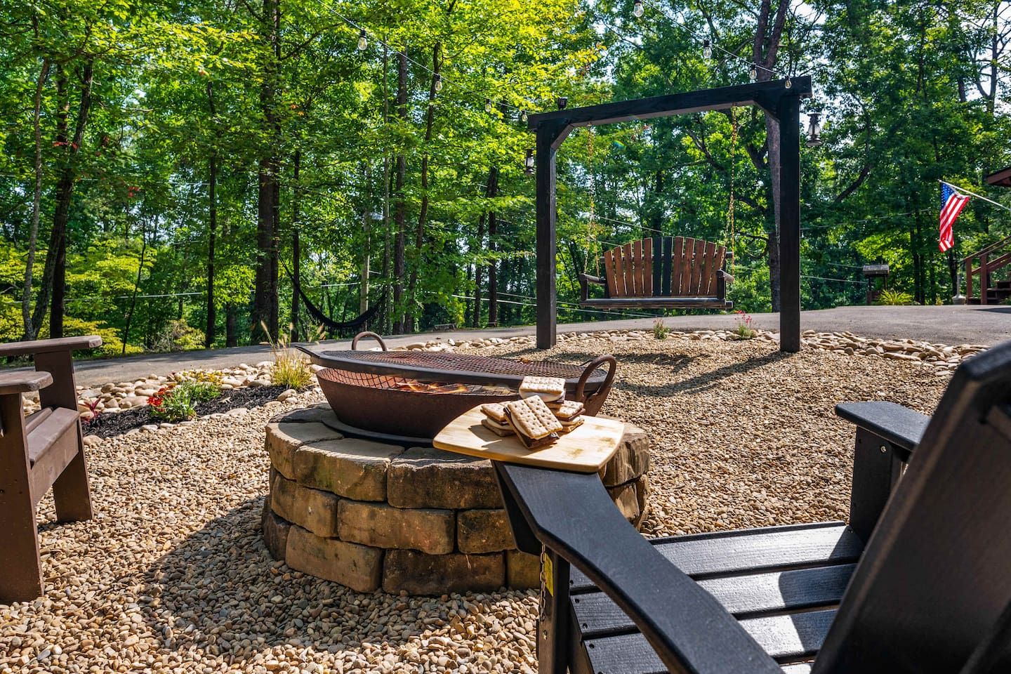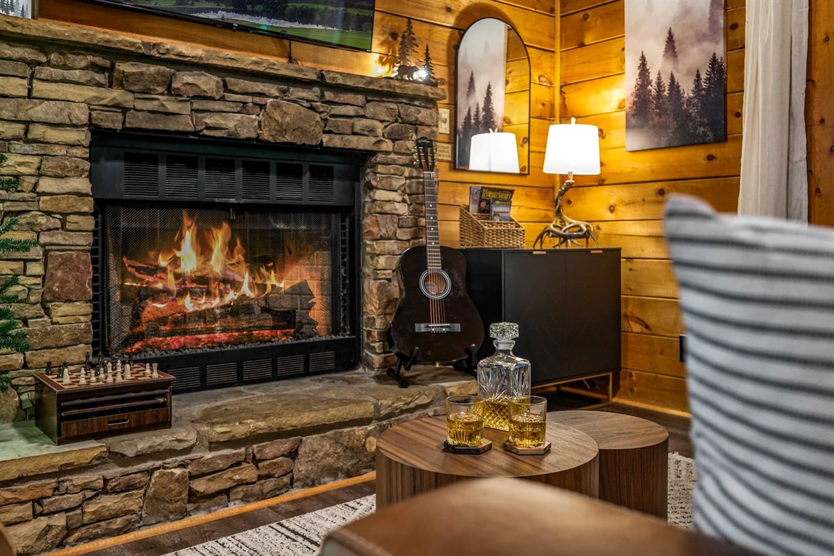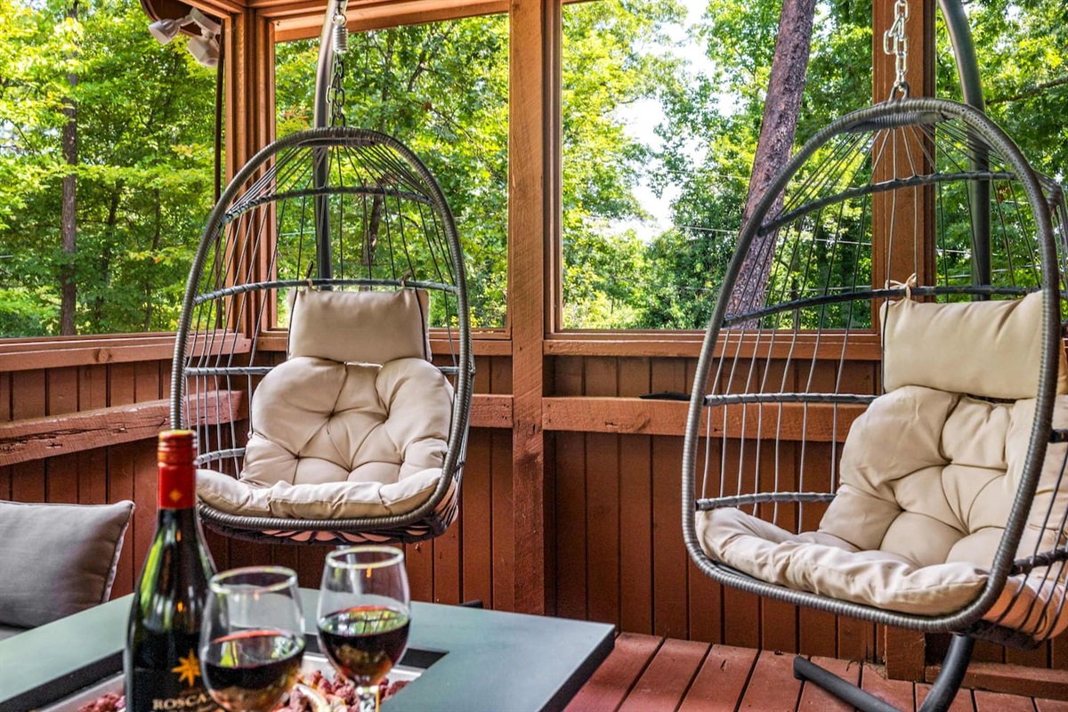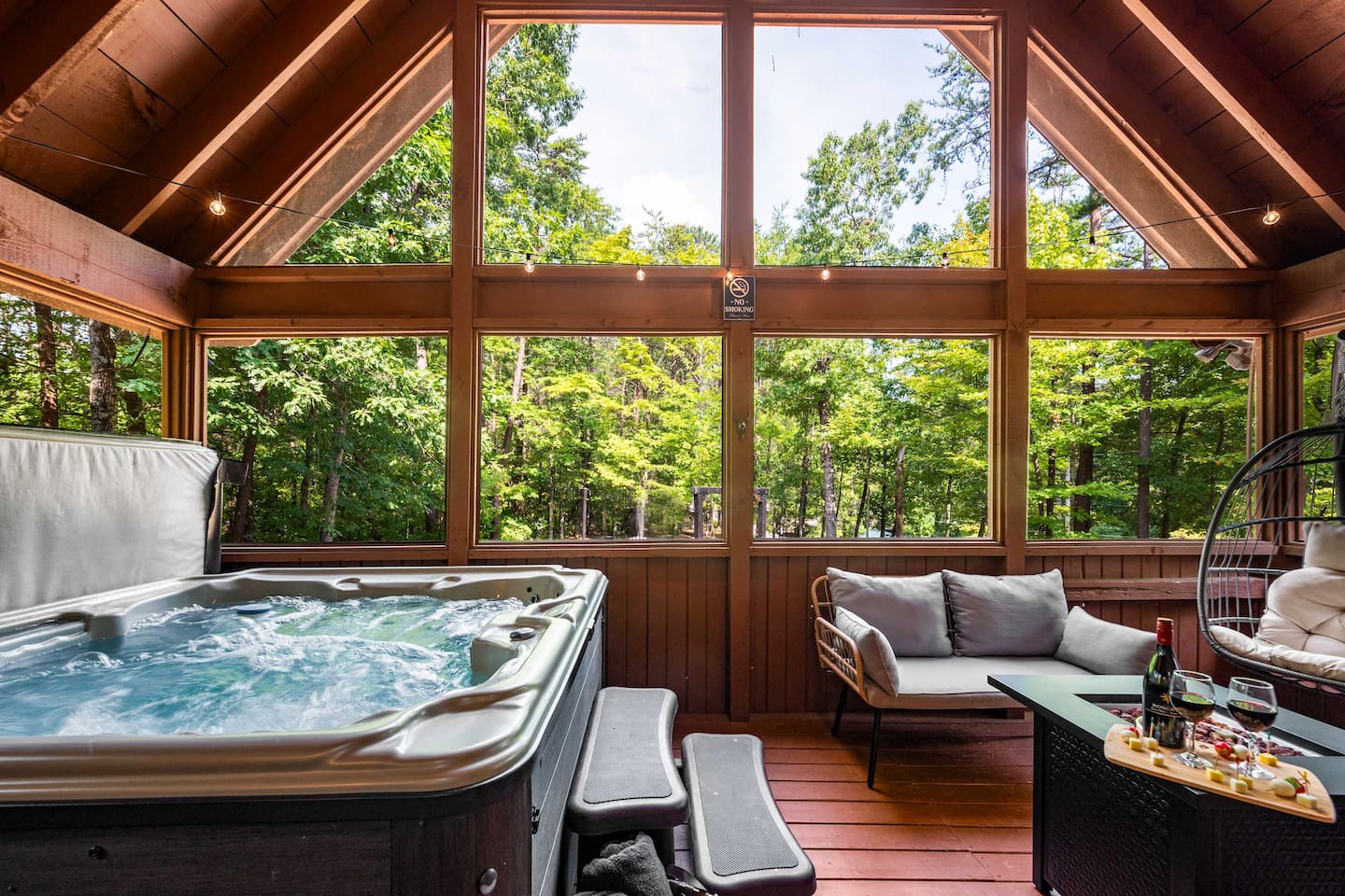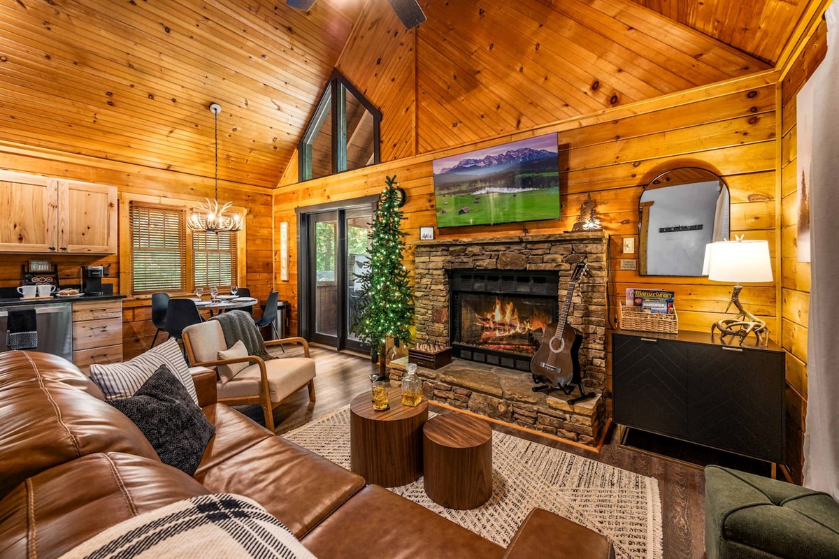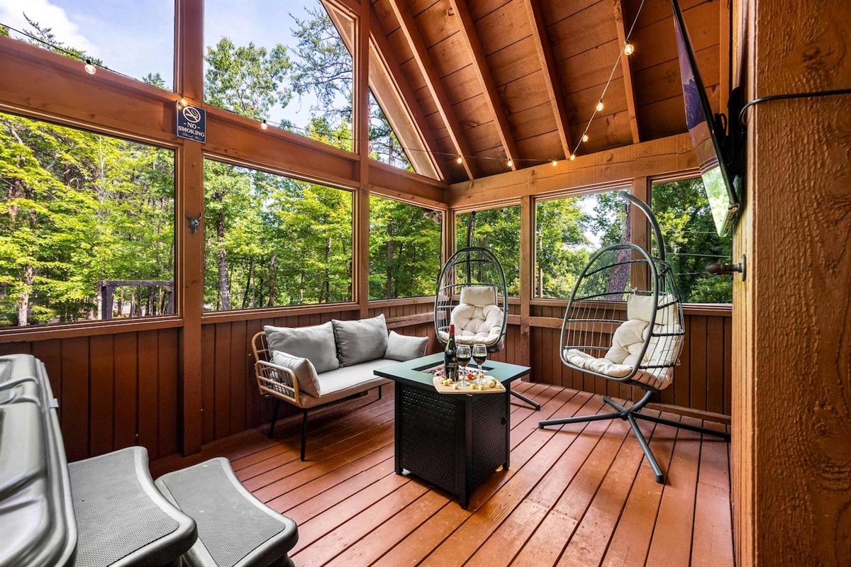 Outdoors? Pure magic. Soak in the hot tub on the screened-in porch, swing beside the fire pit, or snuggle by the indoor gas fireplace. There's even a guitar for you to strum under the stars.